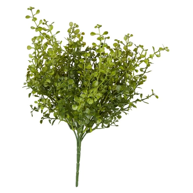 Ihr mögt es, eure heimischen vier Wände nach einem langen Winter mithilfe hübscher Blümchen und Pflänzchen in ein angenehmes Wohlfühlambiente zu tauchen, um den Frühling auf besondere Weise willkommen zu heißen? Dann haben wir hier genau das Richtige! Der üppige Buchsbaumzweig sieht dem Original wahrlich zum Verwechseln ähnlich und eignet sich somit hervorragend, um in der Inneneinrichtung stilvolle Akzente zu setzen. Der Zweig besteht aus Kunststoff, verfügt über eine Länge von 28 cm und darf bei keinem Hobbygärtner fehlen. Durch den natürlichen Look lässt er sich mühelos in jeden Raum integrieren und verleiht ihm eine behagliche Frühlingsatmosphäre, von der ihr und eure Lieben niemals genug bekommt. Also lasst eurer Fantasie freien Lauf und dekoriert munter drauflos!