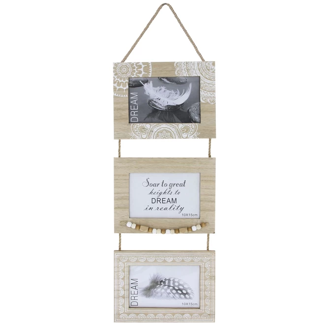Sie sind auf der Suche nach einem außergewöhnlichen Rahmen, welcher Ihre Schnappschüsse zu einem echten Hingucker macht? Dann werden Sie diesen lieben! Der niedliche Hänge-Bilderrahmen ist die moderne Art, um die schönsten Erinnerungen gebührend zur Schau zu stellen. Er besteht aus Holz, misst 52 x 20 x 1 cm und fügt sich aufgrund des natürlichen Designs nahtlos in jeden Raum ein. So bietet er Platz für drei Aufnahmen in den Maßen 15 x 10 cm, welcher er durch den Aufdruck im angesagten Bohème-Design sowie die verspielten Elemente zu einem echten Augenschmaus werden lässt. Aufgehängt an der Wand ist der tolle Rahmen somit die ideale Kombination aus Dekoration und Bilderrahmen, welche fortan bei keinem Trendsetter mehr fehlen darf.
